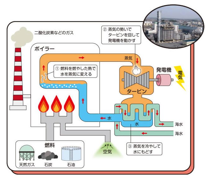 - 火力発電は、燃料を燃やして発生する熱エネルギーを電気に変える仕組みの発電方式
